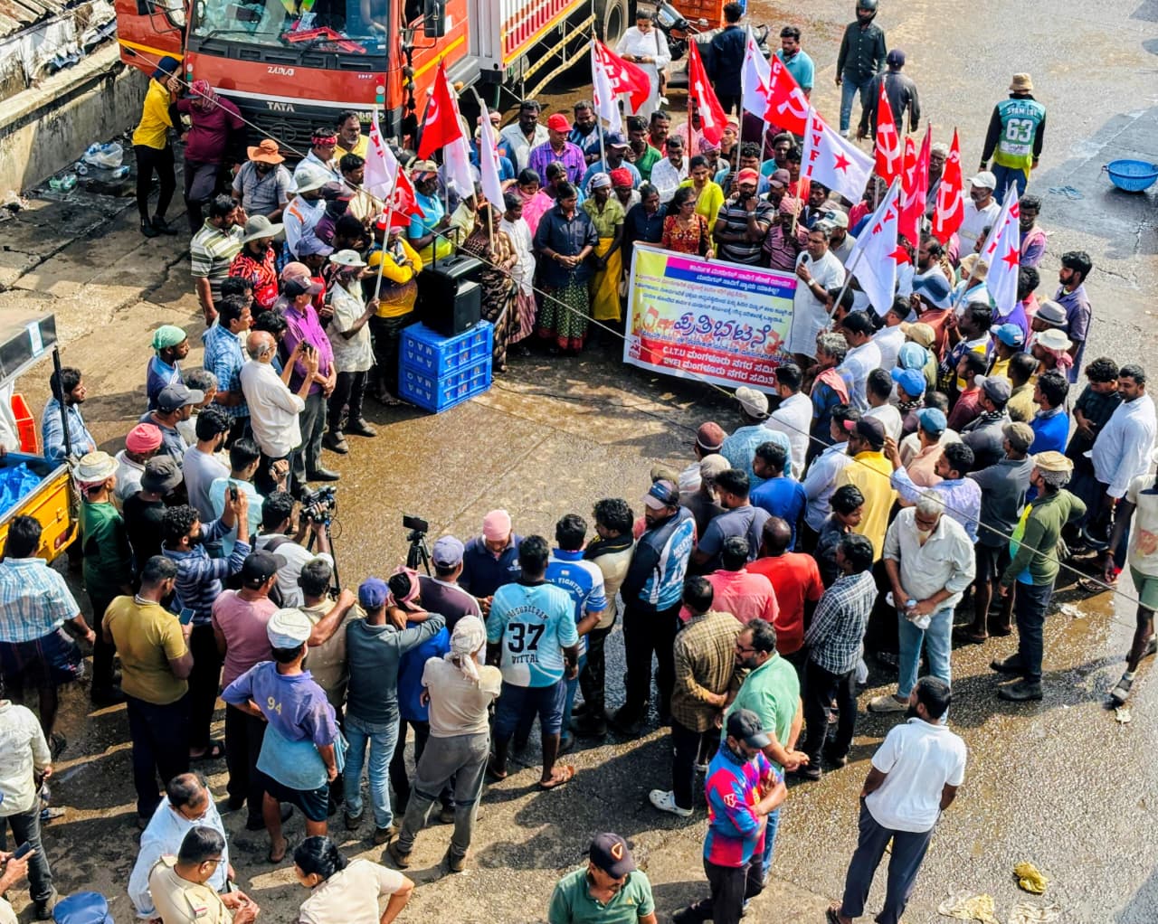300ಕ್ಕೂ ಮಿಕ್ಕಿದ ಮೀನುಗಾರಿಕಾ ಕಾರ್ಮಿಕರು ಮೀನುಗಾರಿಕಾ ಇಲಾಖೆ ಹಾಗೂ ಜಿಲ್ಲಾಡಳಿತದ ಬೇಜವಾಬ್ದಾರಿಯನ್ನು ಖಂಡಿಸಿ ಆಕ್ರೋಶಭರಿತರಾಗಿ ಘೋಷಣೆಗಳನ್ನು ಕೂಗಿದರು.
