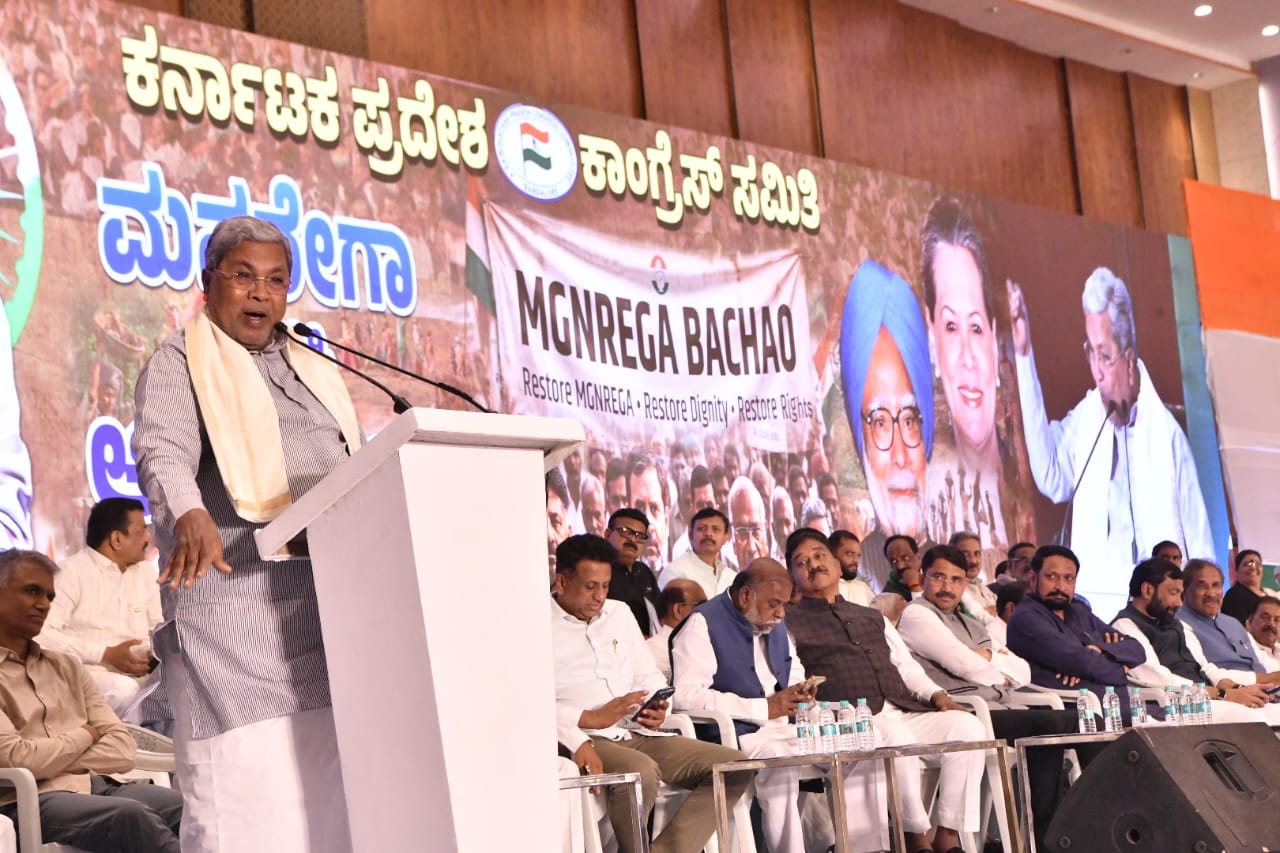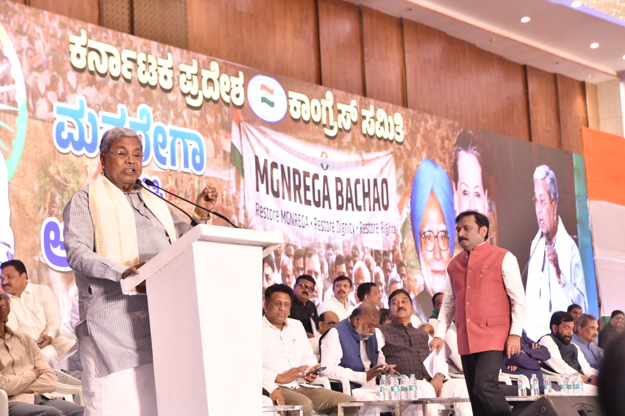 ಬೆಂಗಳೂರು(reporterkarnataka.com): ಕೆಪಿಸಿಸಿ ವತಿಯಿಂದ ಅರಮನೆ ಮೈದಾನದಲ್ಲಿ ಆಯೋಜಿಸಿದ್ದ ಮನರೇಗಾ ಬಚಾವ್ ಸಂಗ್ರಾಮ, ಬಿ.ಎಲ್.ಇ ಪಟ್ಟಿ ಮತ್ತು ಸ್ಥಳೀಯ ಸಂಸ್ಥೆಗಳ ಚುನಾವಣೆಯ ಪೂರ್ವಸಿದ್ದತಾ ಸಭೆಯಲ್ಲಿ ಮುಖ್ಯಮಂತ್ರಿ ಸಿದ್ದರಾಮಯ್ಯ ಅವರು ಮಾತನಾಡಿದರು.
