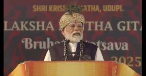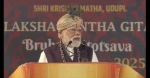 ಉಡುಪಿ(reporterkarnataka.com): ಪರ್ಯಾಯ ಪುತ್ತಿಗೆ ಮಠ ಆಯೋಜಿಸಿರುವ ‘ಲಕ್ಷ ಕಂಠ ಗೀತಾ ಪಾರಾಯಣ’ ಕಾರ್ಯಕ್ರಮದಲ್ಲಿ ಭಾಗವಹಿಸಿದ ಪ್ರಧಾನಿ ನರೇಂದ್ರ ಮೋದಿ ಅವರು ‘ಜೈ ಶ್ರೀಕೃಷ್ಣ’ ಎಂದು ಕನ್ನಡದಲ್ಲೇ ಭಾಷಣ ಆರಂಭಿಸಿದರು.